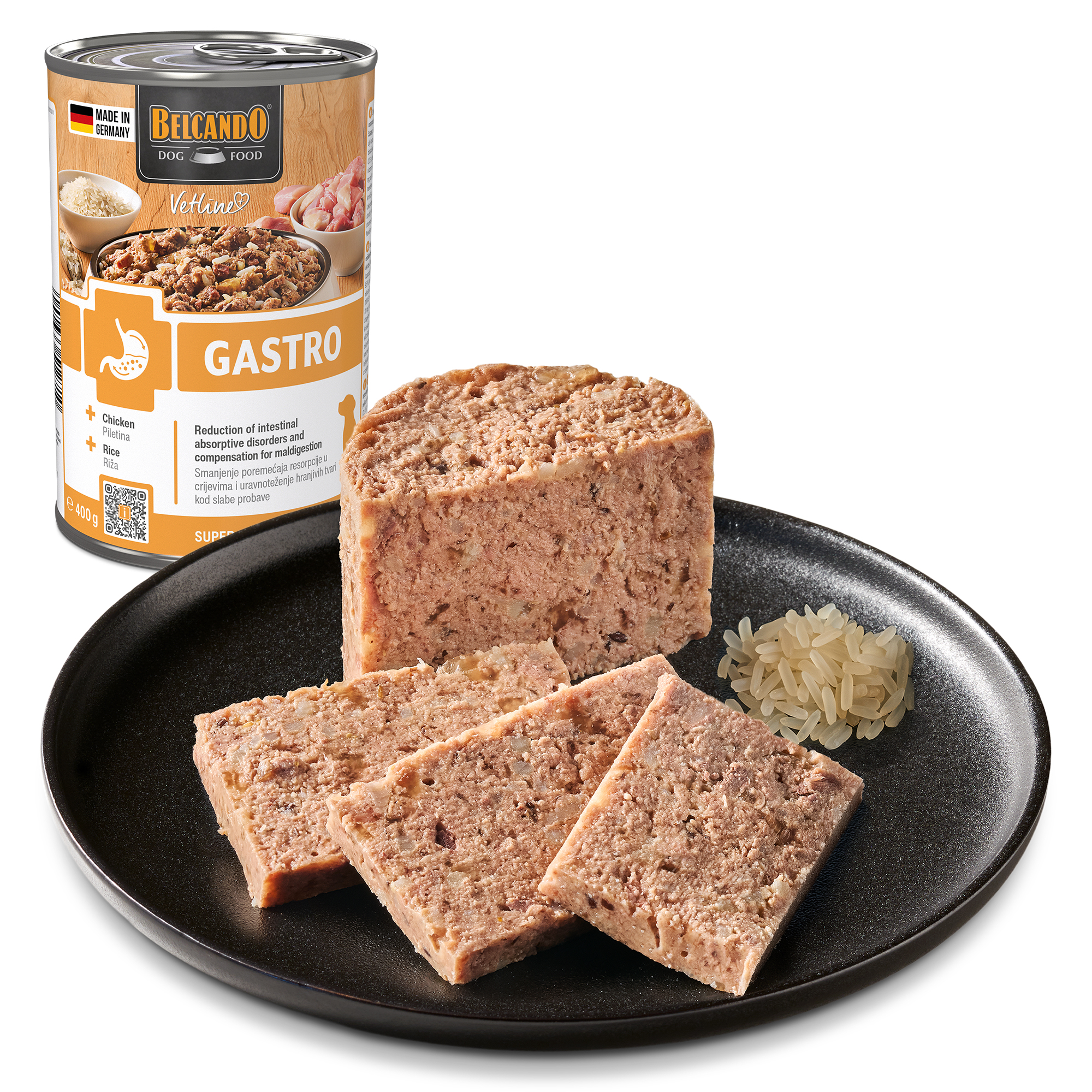 BELCANDO Vetline Gastro è buono e fa bene! Per quali cani è consigliato Vetline Gastro? È consigliato per i cani che soffrono di problemi gastrointestinali, per i quali il veterinario ha raccomandato l'uso di alimenti dietetici adeguati, e per quei cani che devono assumere cibo facilmente digeribile per risolvere disturbi digestivi transitori come vomito e/o diarrea. Nel corso della vita di un cane possono manifestarsi vari problemi di salute. Le malattie del tratto gastrointestinale sono le più frequenti e possono essere gestite efficacemente con l’uso mirato di alimenti speciali come Vetline Gastro. Cosa rende BELCANDO Vetline diverso dagli altri alimenti dietetici completi? Ingredienti di primissima qualità, con un'attenzione meticolosa alla freschezza e all’equilibrio per garantire un gusto eccellente. Questi ingredienti includono preziosi superfood come semi di lino, riso e carne di pollo fresca. Inoltre Vetline offre l’opportunità di scegliere tra alimenti umidi, alimenti secchi o una loro combinazione. Entrambi i tipi di alimenti rispondono in modo ottimale alle esigenze dei cani sensibili alla nutrizione. Per ottenere una transizione agevole, dovresti mantenere le abitudini alimentari del tuo cane. Scegli pertanto il tipo di cibo a cui il tuo cane è già abituato. Se preferisce una miscela di cibo secco e umido, puoi continuare questa consuetudine con le varietà secche e umide di Vetline Gastro.